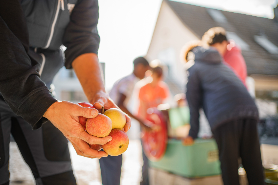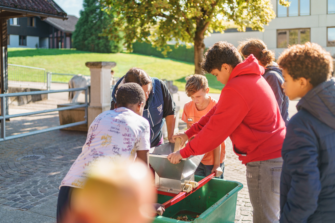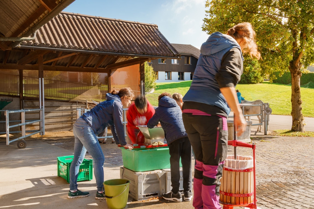Während der Erntezeit pflücken wir mit den Kindern und Jugendlichen gemeinsam Äpfel und bringen sie zum Mosten weg. Bei dieser beliebten Tradition verbinden wir den Spass an der Arbeit mit einem schmackhaften Ergebnis, denn wir können jährlich mehrere hundert Liter eigenen Apfelsaft aus unseren Obstbäumen gewinnen.