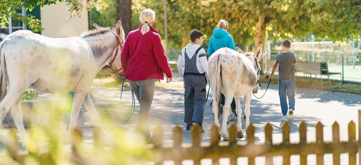 Die Arbeit mit Pferden und unseren speziell ausgebildeten Eseln ist ein wichtiges pädagogisches und therapeutisches Element. Durch die Pflege der Tiere und den Körperkontakt bauen die Kinder eine emotionale Bindung auf, lernen Ängste zu überwinden und negative Gefühle wie Aggressionen zu bewältigen. Und wenn sie sich um unsere Kleintiere wie Hasen und Hühner kümmern, lehrt sie diese Aufgabe Verantwortungsbewusstsein und hilft ihnen so dabei, ihren Platz in der Gemeinschaft zu finden.